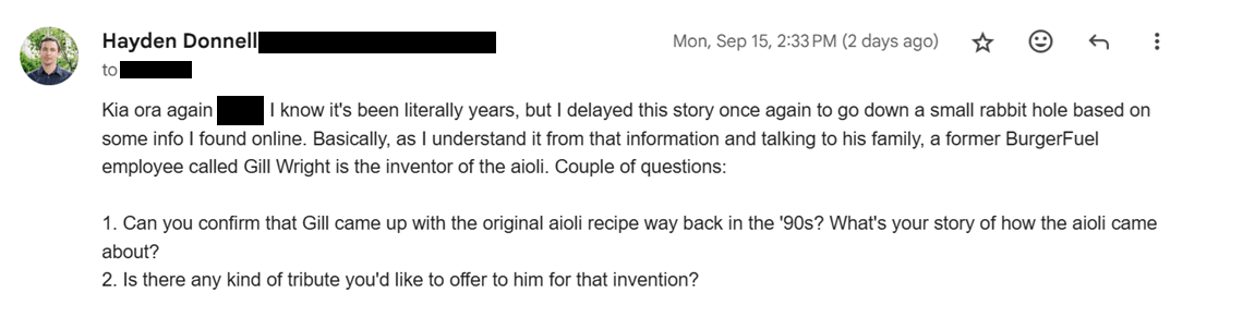 The Spinoff contacted Mark Wright. He confirmed his older brother, whose name is really spelt Gill, came up with the aioli back in the 90s. But the family was in a period of flux and Gill wasn’t up to being interviewed. Over the next few months, Wright expanded a little on his initial email, hinting at lingering tension between Gill and BurgerFuel over the severance of their business relationship. But the interview never came about, and Wright eventually stopped responding to emails and calls. BurgerFuel didn’t reply to a request for comment about Gill.