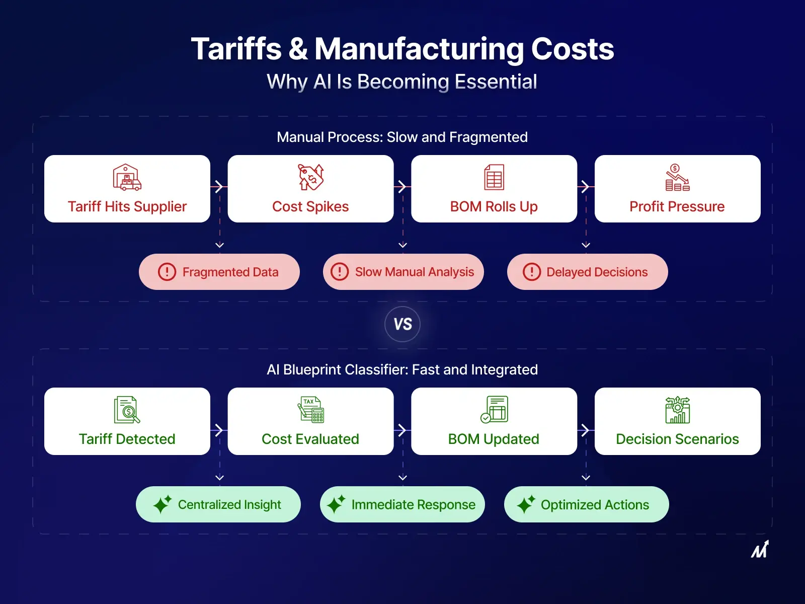 AI allows manufacturers to automatically extract specifications from technical drawings, quickly analyze potential cost impacts, identify alternative suppliers, and monitor tariff classifications continuously. This reduces the time and effort required for decision-making compared to traditional manual processes.