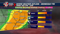 Wednesday brings another potentially significant severe thunderstorm outbreak. Ingredients for severe storms actually look more favorable than what we saw with Sunday’s system. That setup was rather borderline with respect to wind shear. Wednesday’s setup presents higher shear for rotating storms, combined with ample moisture and enough instability for explosive storm development. All forms of severe impacts are possible, including damaging winds, large hail, and possibly strong / long-track tornadoes. Timing of storms looks to be from mid afternoon into the evening (3PM-10PM). We are currently in a level 3/5 enhanced risk from the Storm Prediction Center, but they have already hinted at the potential for a future upgrade. A risk of severe storms could continue into Thursday.